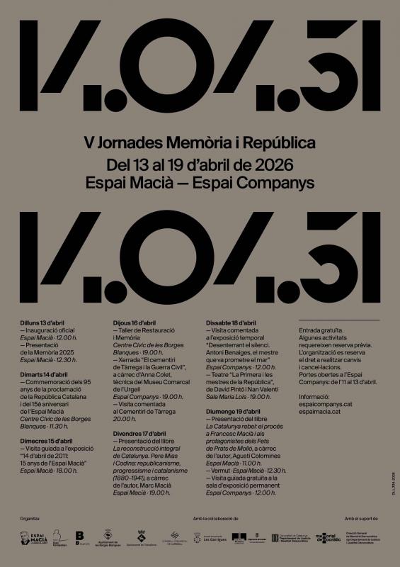 Del 13 al 19 d'abril, l'Espai Macià de les Borges Blanques i l'Espai Companys del Tarròs impulsen la cinquena edició de les Jornades Memòria i República, una iniciativa consolidada que situa la memòria democràtica i el llegat republicà al centre del debat públic i cultural a Ponent.